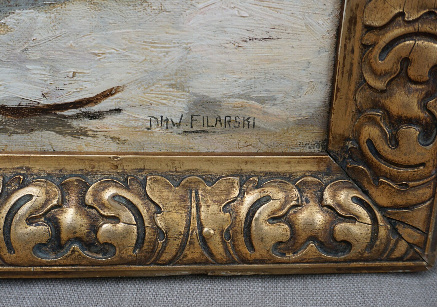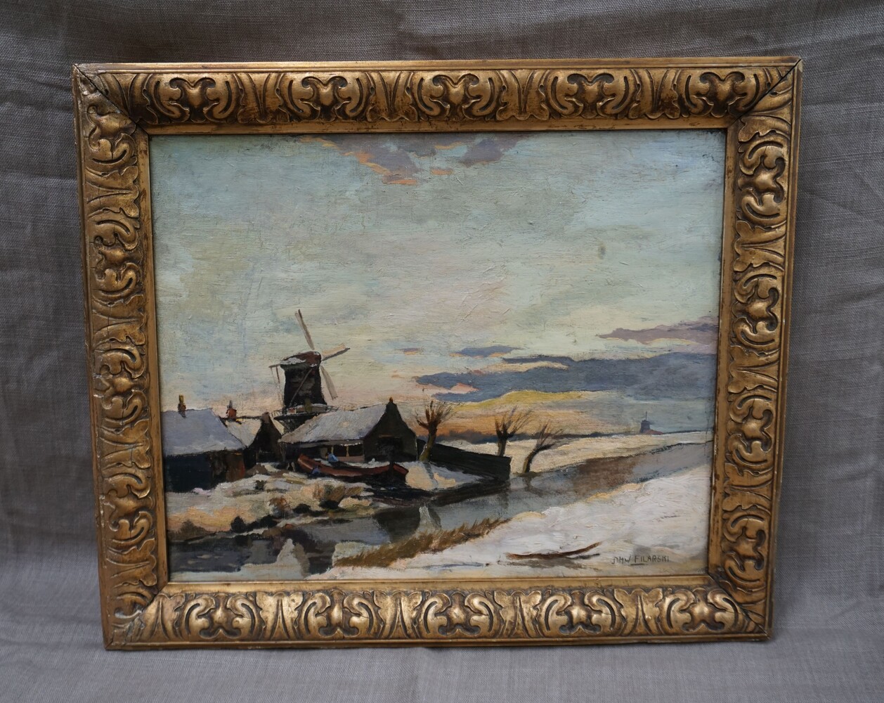 Oil on canvas with a repair visible on the rear of the canvas, condition reasonable but frame showing its age with lightly distressed gilt work, signed Filarski.