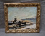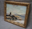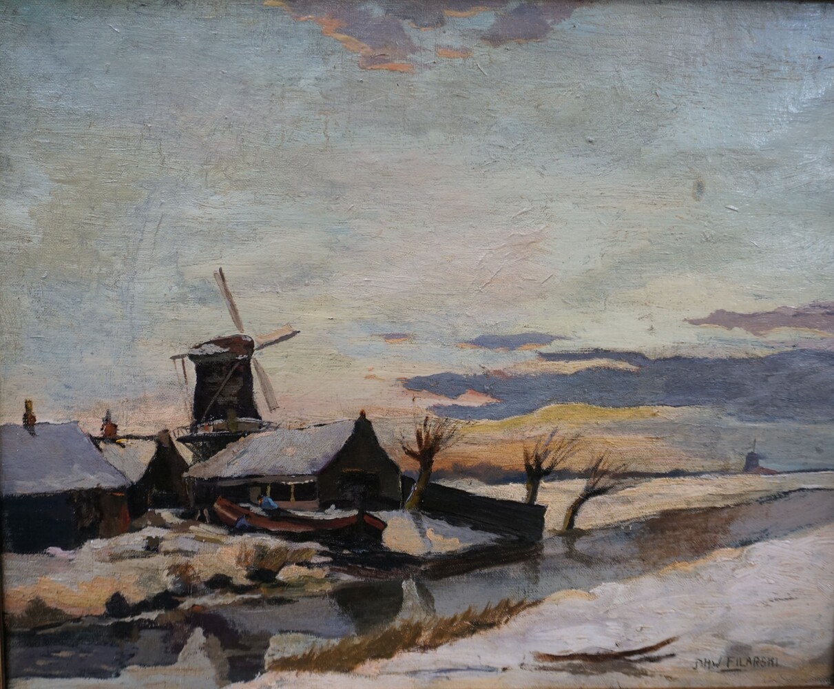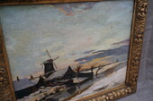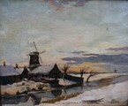 Lovely 20s impressionist work depicting a Dutch snow covered landscape with a river, farmhouse and a mill,