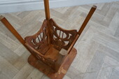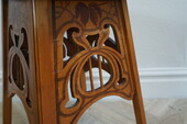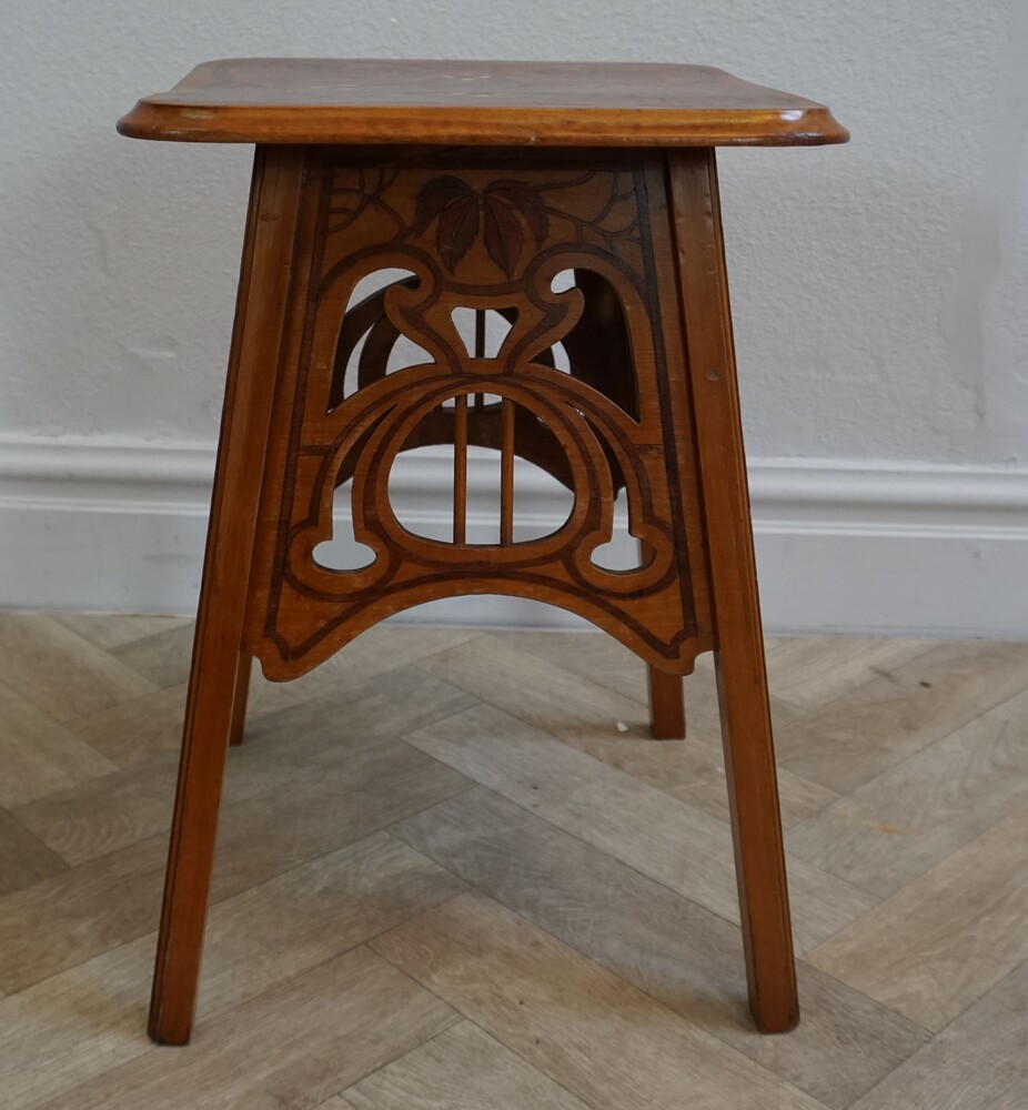 This is a delightful Art Nouveau table from the 1890s, stylish form with typical nouveau decoration curved design with cut out rails. It appears to have been inlaid, but this is burnt in poker lines and coloured stains on a light cedarwood frame. This piece has been completely restored and is in a strong condition.